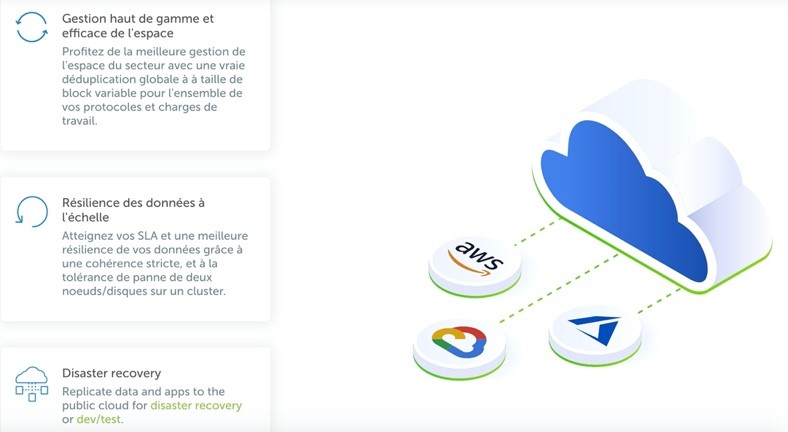 - Intégration native avec le Cloud afin de répliquer nativement les sauvegardes vers Amazon, Azure ou Google ou pour créer un Cluster Cohesity et d’assurer un PRA (Disaster Recovery).
